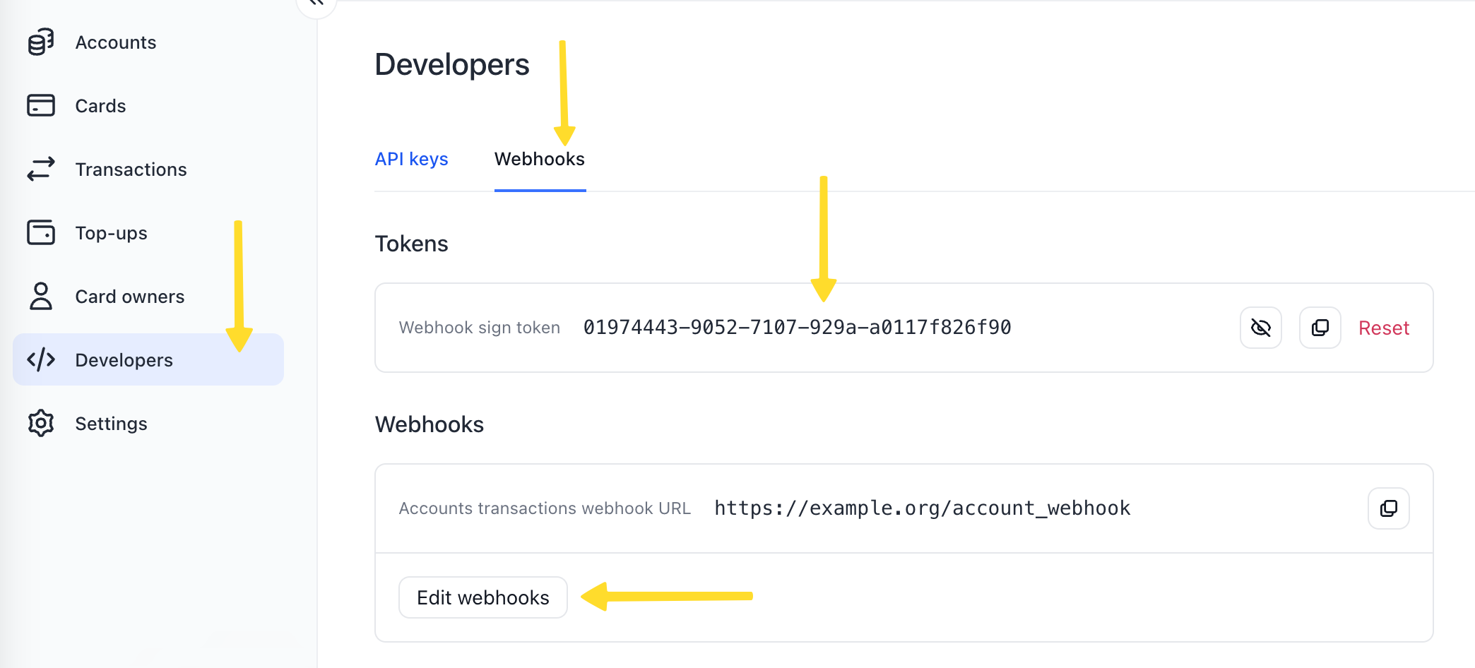 - Cards transactions webhook URL - see Card Transaction Event in the API reference